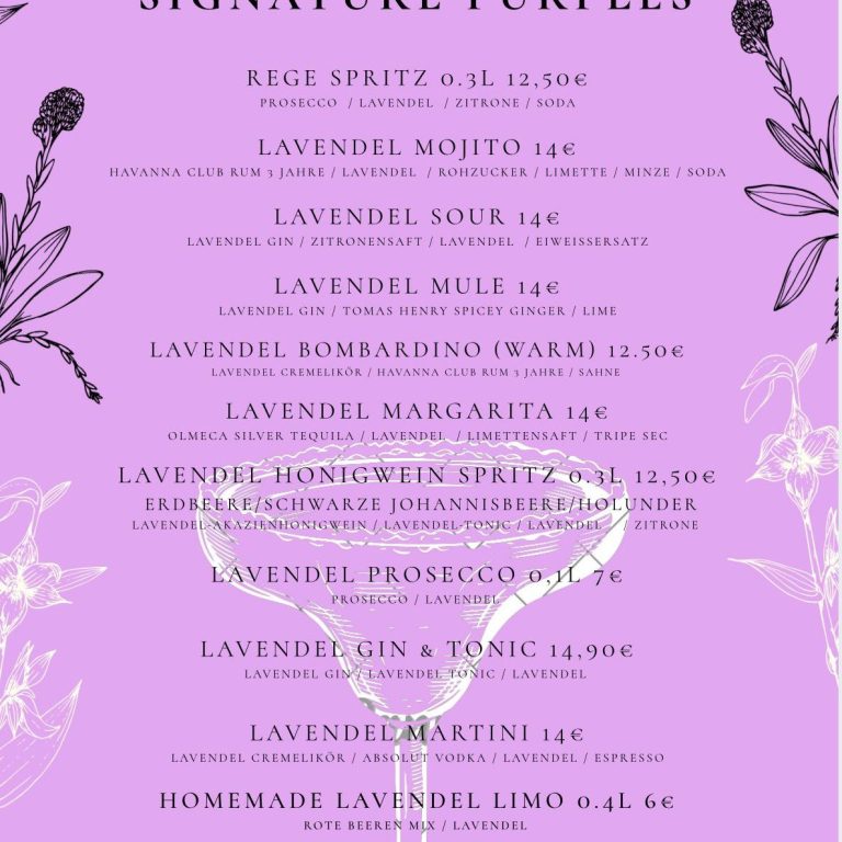 Wir bieten eine große Auswahl an Getränken mit und ohne Alkohol – von unseren beliebten Signature Purples klassische und kreative Cocktails bis hin zu erfrischenden Softdrinks. Auch Kaffeeliebhaber kommen auf ihre Kosten: Unsere Kaffeevariationen mit feinem Lavendelaroma sorgen für besondere Genussmomente.